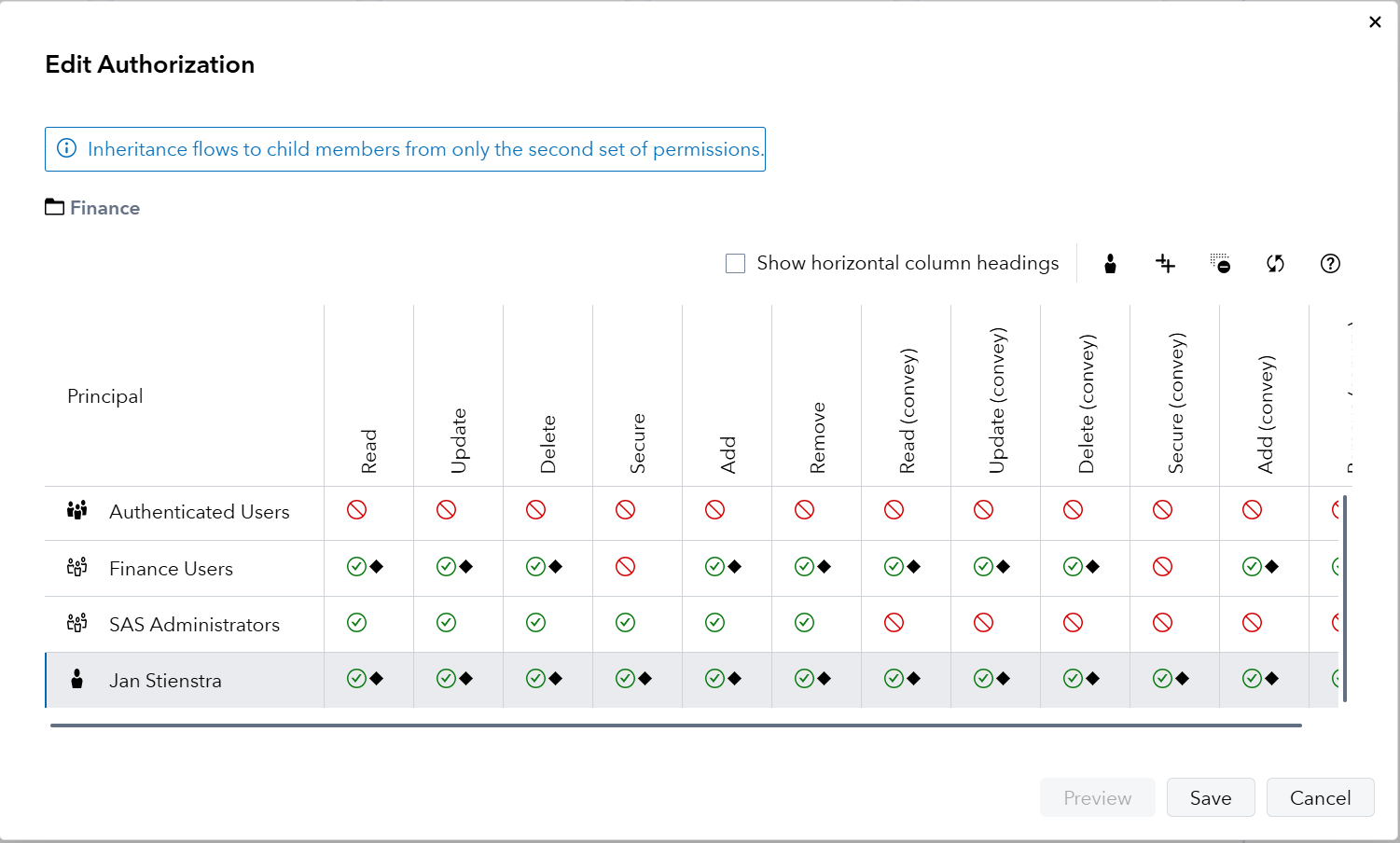 The general authorization system grants is used to grant access to both functionality and capabilities as well as access to content such as files stored in the SAS Viya platform. Extensive documentation about this authorization system can be found in the link above. For this section we will just give an example of how to grant permissions to the OAuth client, via its group memberships, to functionality and content.